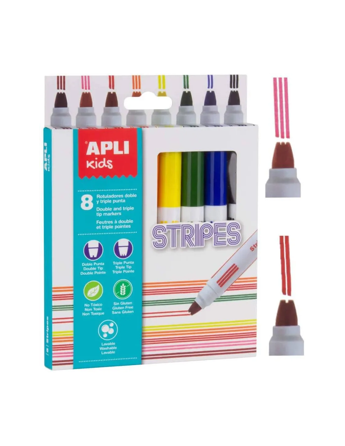 Caja de 8 rotuladores stripes tamaño 14,4 x 137 mm, colores surtidos: amarillo, naranja, rojo, rosa, verde, azul, marrón y negro Rotuladores de cuerpo cilíndrico con doble y triple punta redonda bloqueada de 7,5 mm para crear divertidas y originales pinturas con 2 o 3 rayas Los rotuladores APLI Kids son fácilmente lavables, disponen de capuchón ventilado anti asfixia, no son tóxicos ni contienen gluten y su tinta es de larga duración, se lava fácilmente con agua y jabón.