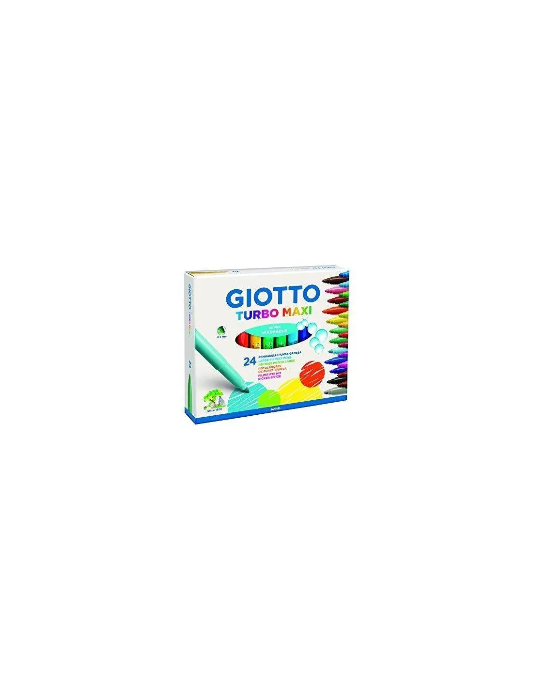 GIOTTOCaja de 24 rotuladores escolares Giotto Turbo Maxi, de punta gruesa de 5 mm. Los rotuladores escolares Giotto son los más completos y seguros del mercado para uso infantil. Por fuera: puntas redondas de fibra ultra resistentes y duraderas, bloqueadas para evitar que se hundan; tapones de seguridad y capuchones ventilados anti-ahogo. Por dentro: tintas seguras e inocuas, a base de agua y de muy larga duración, las tintas de los rotuladores Giotto son lavables en la piel, con agua y jabón, pero también pueden eliminarse de la ropa con un ciclo normal de lavadora a 40º.