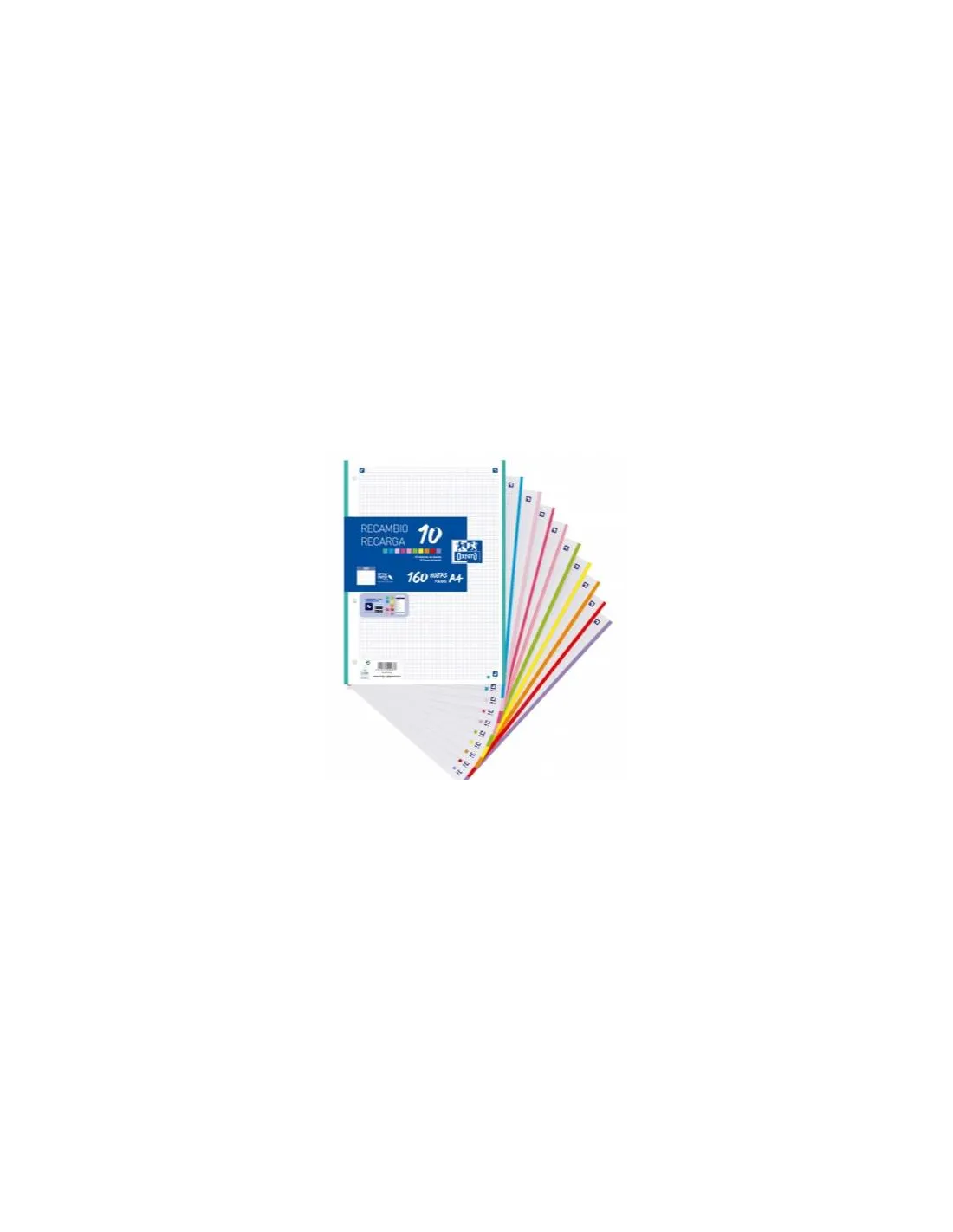 OXFORDRecambio OXFORD retractilado en paquete de 160 Hojas con 10 colores de banda y 4 taladros de archivo para poder guardar las hojas en un archivador o carpeta de anillas. Ideal para quienes prefieren hojas sueltas y llevar sólo las que necesiten. Puedes organizarte para utilizar un color por asignatura o tema.