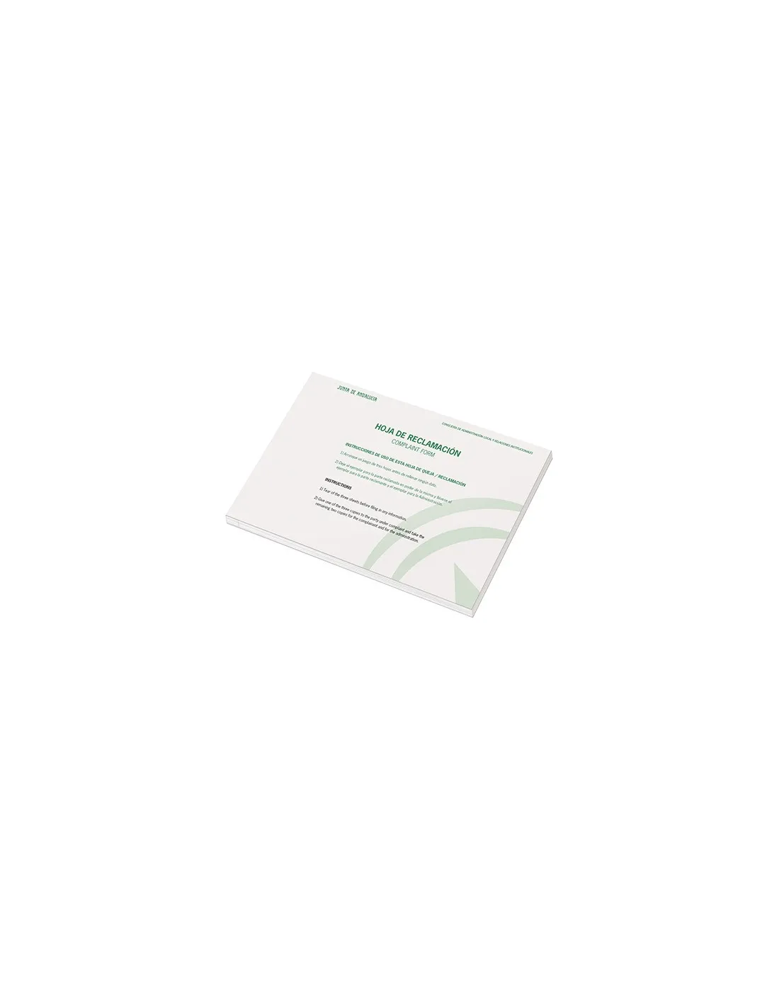 Libro de hojas de reclamaciones exclusivo para la Junta de Andalucía. Formato 312 x 210mm, tamaño A4 apaisado. Papel de 60 gr. Contiene un total de 75 hojas, organizadas en 25 juegos de 3 hojas cada uno: una para la administración, una para la parte reclamada y una para la parte reclamante.Libro de hojas de reclamaciones exclusivo para la Junta de Andalucía. Formato 312 x 210mm, tamaño A4 apaisado. Papel de 60 gr.