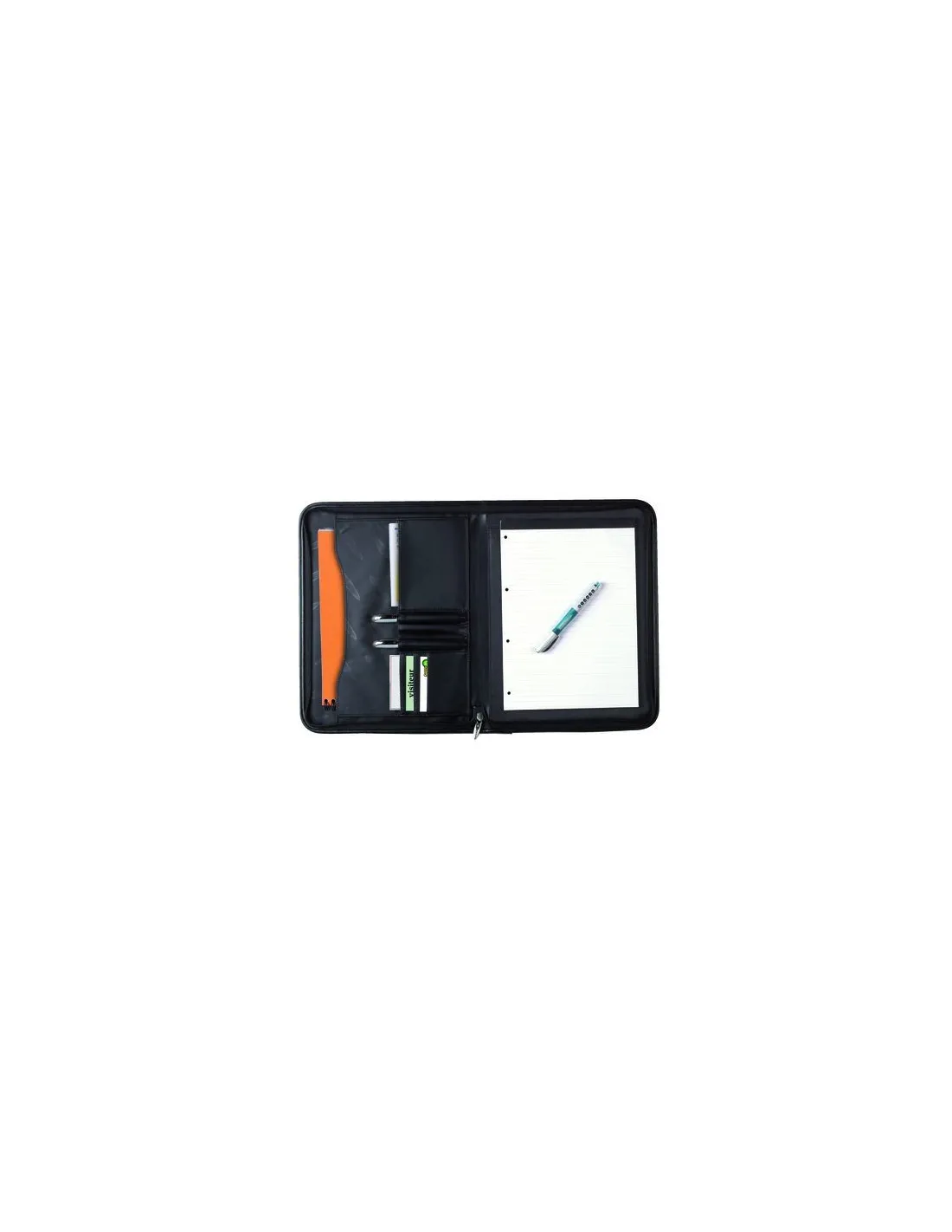 Portadocumentos de mano con cierre de cremallera. Dispone de bolsillos para bolígrafos, tarjetas de visita y documentos. Incluye un bloc A4. Dimensiones. 28 x 36 x 2,5 cm.