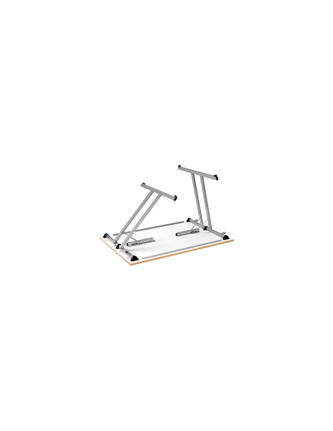 Mesa plegable y apilable con fijación de seguridad en posición abierta y cerrada. Tablero de panel de partículas melaminadas con tratamiento antirreflejos, grosor 19 mm. Cantos PVC antichoque, grosor 3 mm. Patas de tubo metálico lacado epoxi, sección 35 x 20 mm. Calzos de regulación en altura para compensar desniveles del suelo, al ser plegable se pude guardar sin que prácticamente ocupe espacio , Grosor plegada: 9,5 cm.