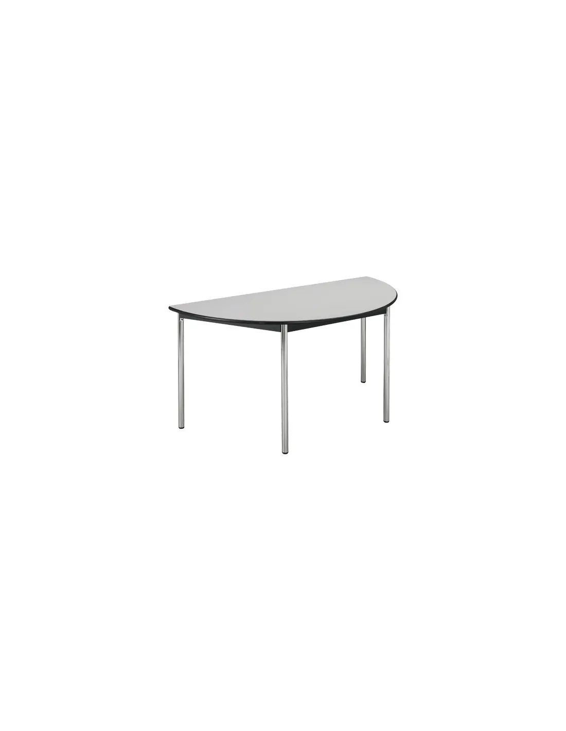 Tableros paneles particulas melaminadas, grosor 19mm. Cantos PVC antichoque redondeados, grosor 3 mm, con borde que recubre el tablero. Patas y estructura metal lacado epoxi. Patas de tubo Ø 32 mm. Calzos de regulación altura. Montaje facil. Dimensiones:Alt 75 Tablero semorredondo: Ø 140 cm.Mesa multiforma Confort. Semirredondo diámetro 140 cm. Patas cromadas/Tablero haya.