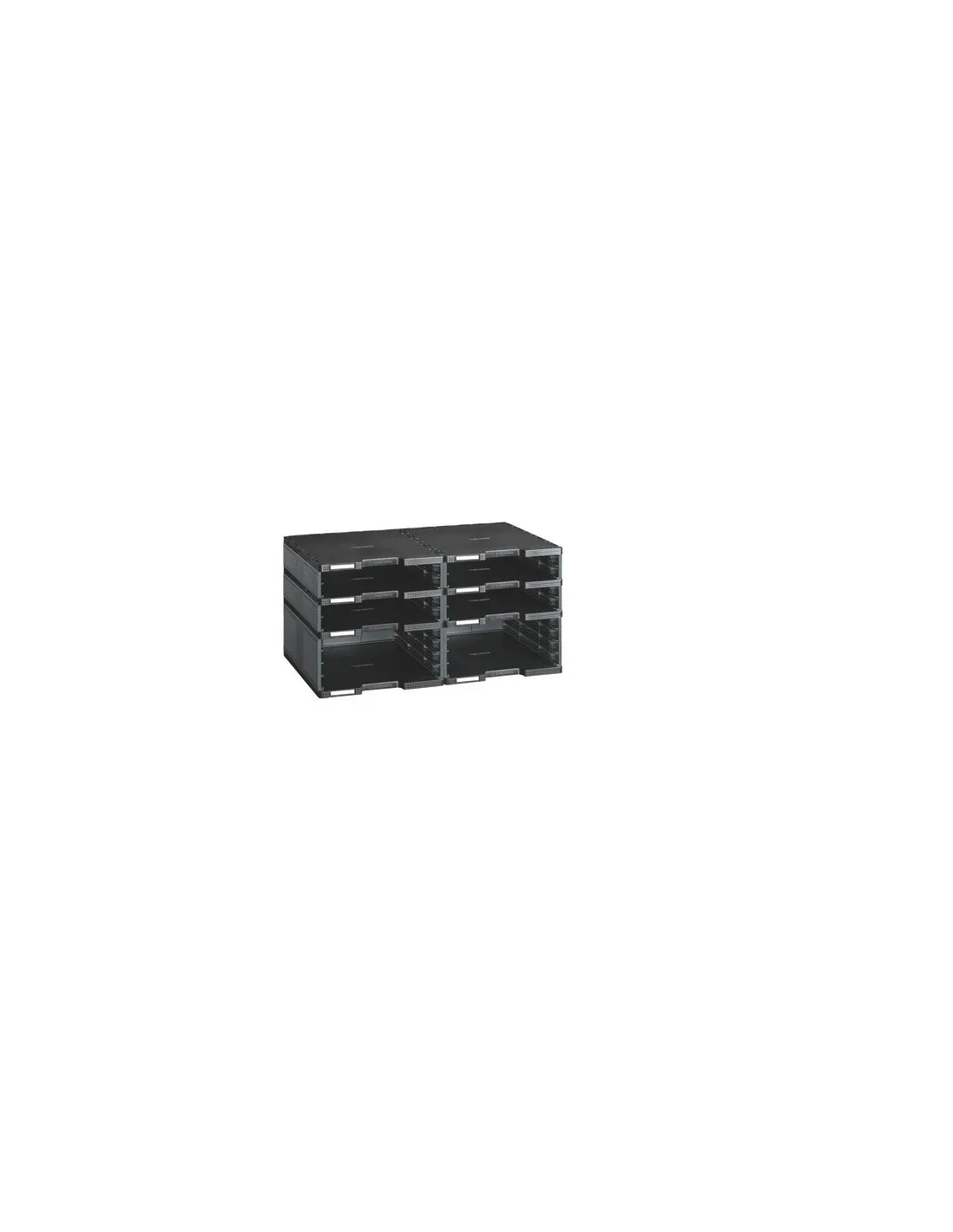 Modulo organizador 2 casillas jumbo + 4 casillas normal .Para documentos de un formato de hasta 24 x 32 cm. En plástico de poliestireno reciclable. con la certificación Angel Azul. Exterior gris. interior negro. Se entrega desmontado. 2 tipos de compartimentos: Estándar de dimensiones externas: Alt. 8.9 x An. 28.8 x Fon. 35.4 cm y útiles: Alt 5.9 x An 25.6 x Fon 34 cm. Jumbo de dimensiones externas: Alt. 14.5 x An. 28.8 x Fon. 35.4 cm y útiles: Alt. 11.6 x An. 25.6 x Fon. 34 cm..Para documentos de un formato de hasta 24 x 32 cm. En plástico de poliestireno reciclable. con la certificación Angel Azul. Exterior gris. interior negro. Se entrega desmontado