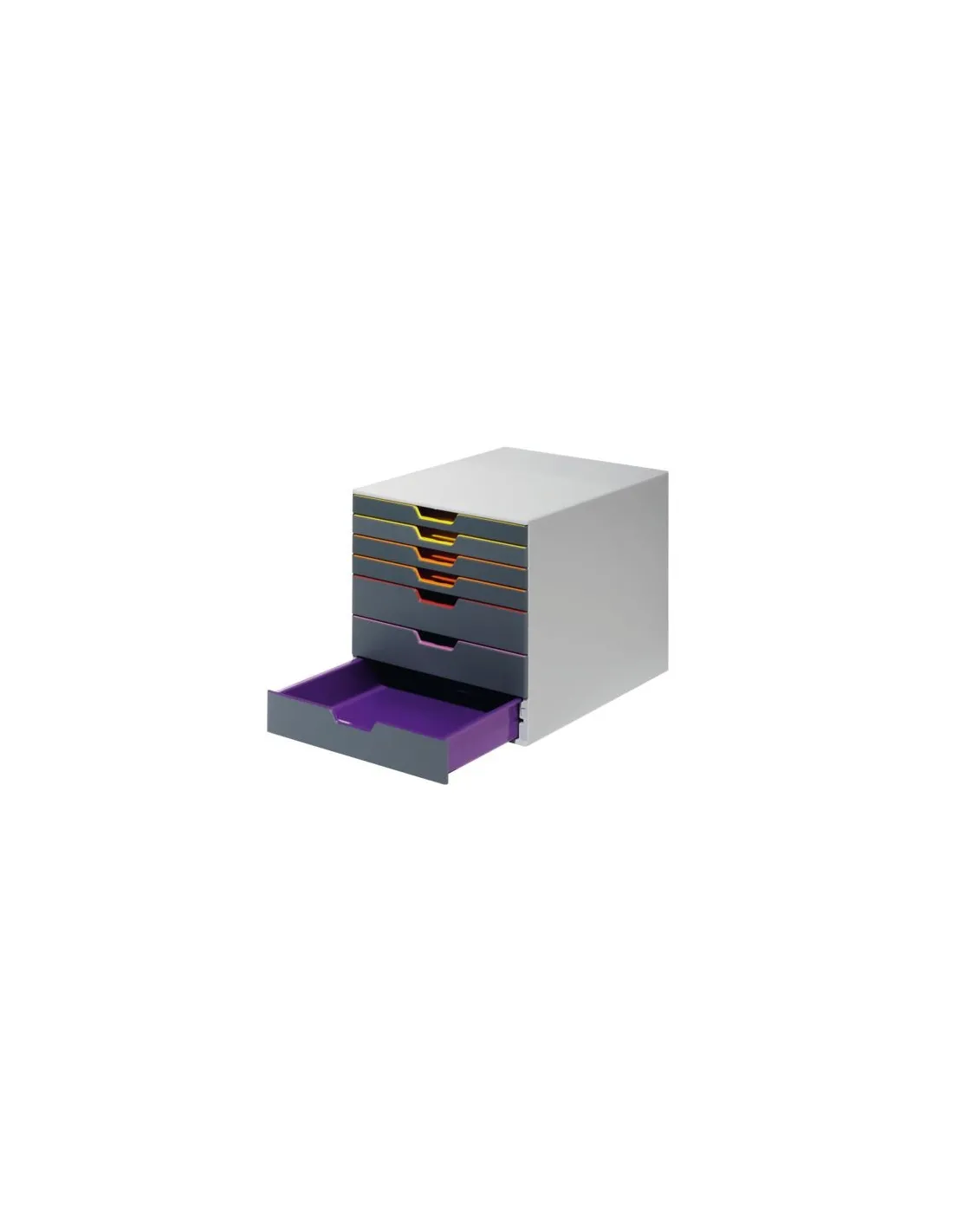 Modulo organizador organizador Varicolor 7 cajones Durable. Cajones de deslizamiento suave y silencioso con tope de detención. Incluyen portaetiquetas y tarjetas Bristol. Apilables. Base antideslizante. Para documentos de un formato de hasta 24 x 32 cm. Medidas totales: Alt. 28 x An. 29.2 x Fon. 35.6 cm. En ABS muy resistente. Base gris. Modelo de 7 cajones: hasta 140 hojas para los 4 cajones pequeños de Alt 2.3 cm y hasta 430 hojas para los 3 cajones grandes de Alt. 5 cm.Cajones de deslizamiento suave y silencioso con tope de detención. Incluyen portaetiquetas y tarjetas Bristol. Apilables. Base antideslizante. Para documentos de un formato de hasta 24 x 32 cm