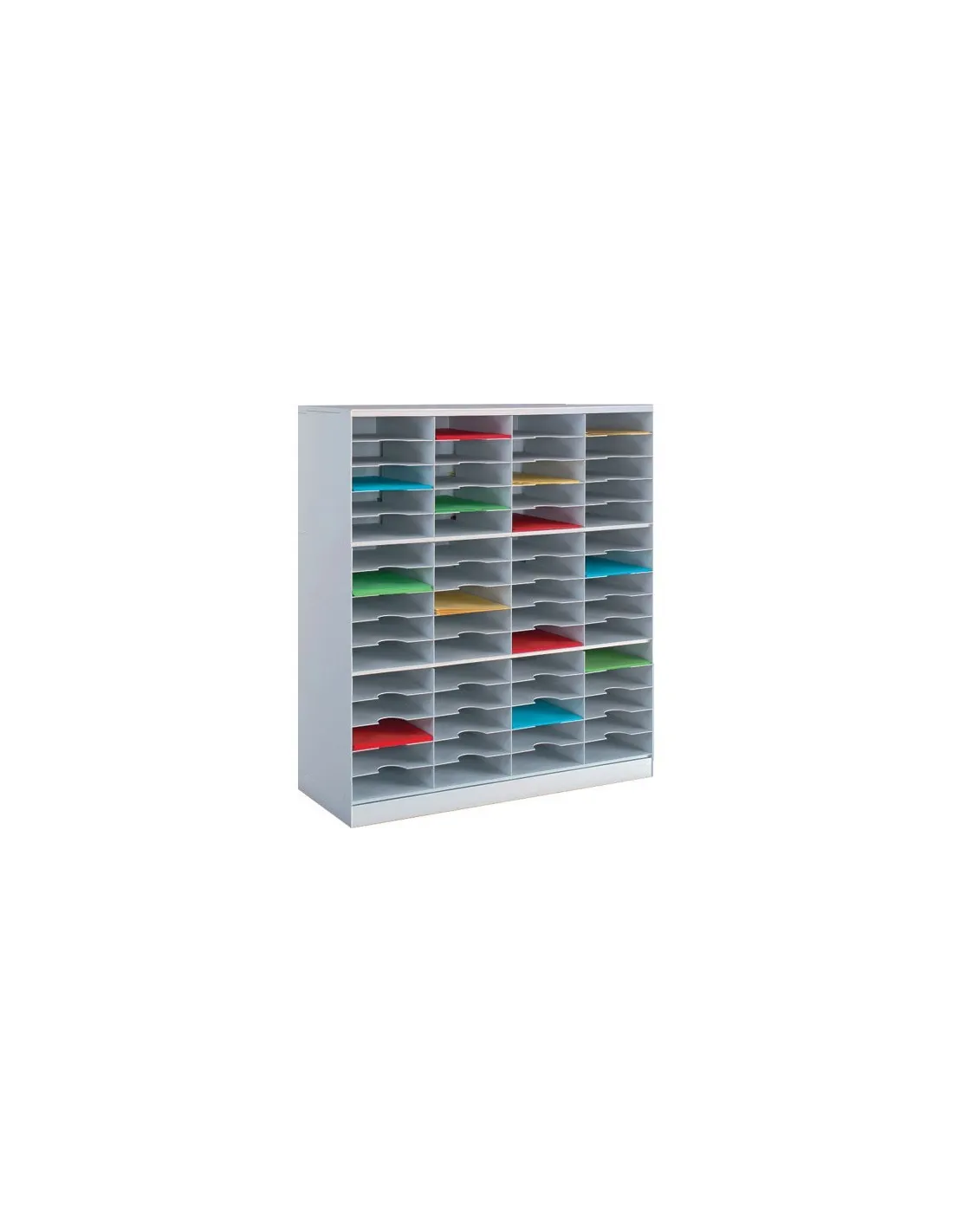Modulo organizador de 20 compartimentos para clasificar documentos de un formato de hasta 24x32 cm, módulo compuesto de 4 columnas de 5 compartimentos indexados (no extraibles) medidas útiles de cada compartimento en cm :Alto 6 x ancho 22 x 30 de fondo.