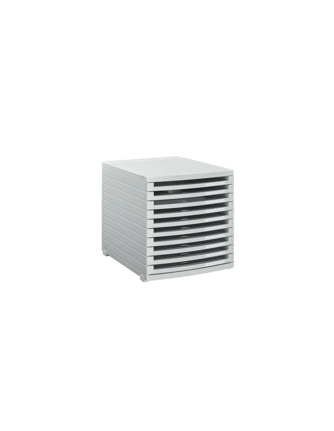 Modulo organizador 10 cajones abierto gris Han. En poliestireno gris antiestático sin metales pesados. Los cajones tienen un tope trasero y un hueco en la parte delantera para retirar los documentos con facilidad. Cada cajón lleva un portaetiquetas. Modelo 10 cajones: medidas totales: Alt. 30.7 x An. 30 x Fon. 38.2 cm. Altura de cada cajón: 2.3 para el modelo de 10 cajones.En poliestireno gris antiestático sin metales pesados. Los cajones tienen un tope trasero y un hueco en la parte delantera para retirar los documentos con facilidad.