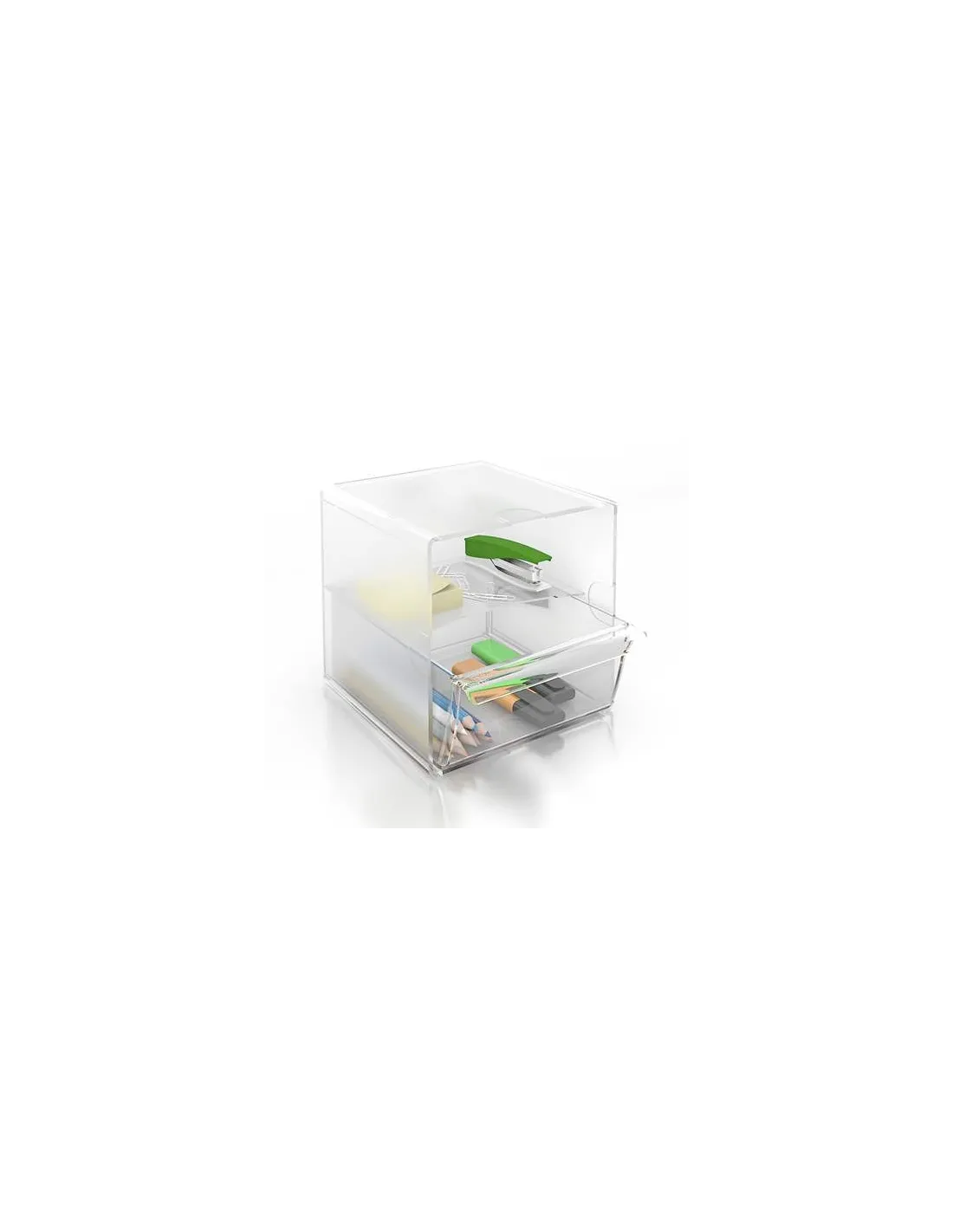 Organizadores modulares de poliestireno transparente de gran calidad y alto brillo. Ideales para organizar y clasificar todo tipo de pequeño material en el interior de armarios, estantes o cajones. Su innovador sistema de clips permite unirlos y apilarlos tanto en vertical como en horizontal. Se ofrecen diferentes posibilidades de clasificación: huecos, con divisores tanto en vertical como en horizontal o con distintas combinaciones de cajones. Cada modelo incluye 2 clips de sujeción. Medidas exteriores: 150x150x150mm.1 cajón grande extraíble que se puede colocar tanto en la parte inferior como en la superior. Interior cajón: 145x135x65 mm.Organizadores modulares de poliestireno transparente de gran calidad y alto brillo. Ideales para organizar y clasificar todo tipo de pequeño material en el interior de armarios, estantes o cajones. Su innovador sistema de clips permite unirlos y apilarlos tanto en vertical como en horizontal.