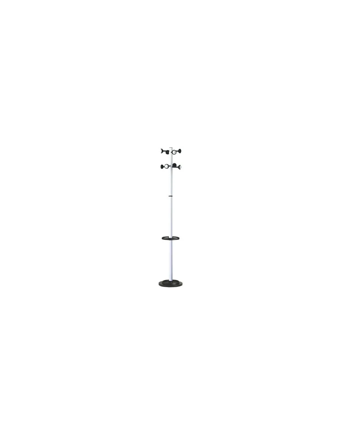 Perchero con 8 colgadores pivotantes. Paragüero integrado con recuperador de agua. Cuerpo tubo de metal lacado Ø 50 mm. Revestimiento lacado epoxi. Altura 175 cm. Zocalo de Ø 34 cm que garantiza una perfecta estabilidad.Perchero recepción metal blanco