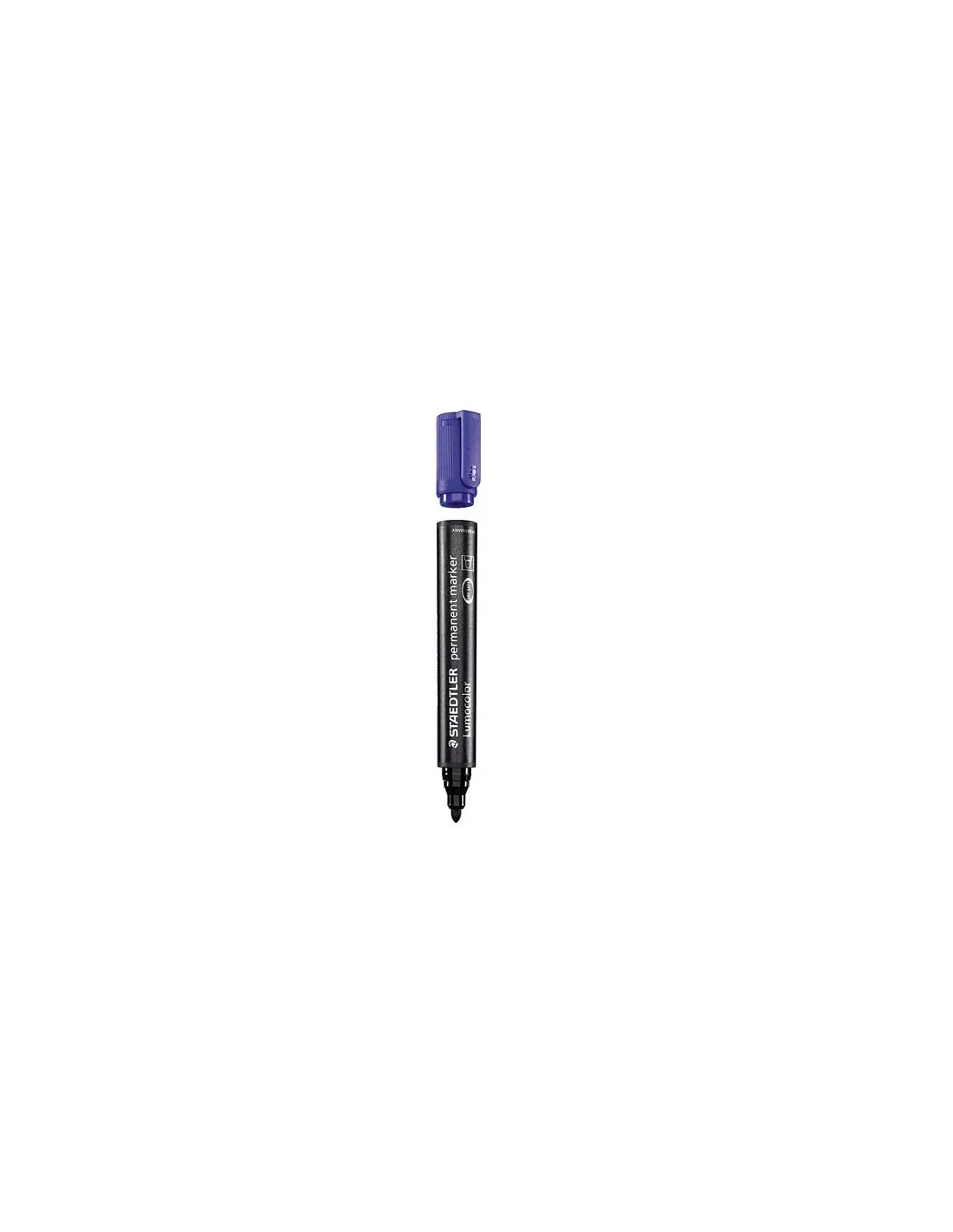 No se seca. resistente al agua y a la luz. Tinta base de alcohol, sin hidrocarburos ni tolueno, inodoro. Punta cónica. Secado rápido. Cuerpo y tapón de polipropileno. Color Azul. Trazo 2mm.Lumocolor permanent Marker