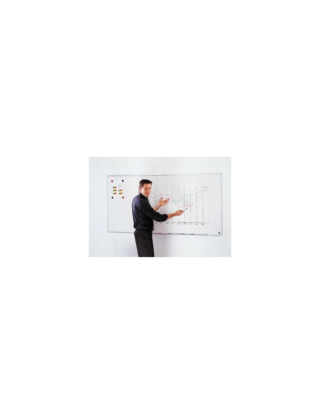 Pizarra blanca con marco de aluminio anodizado natural, chapa de acero esmaltado recocido al horno a 800 º de temperatura. es un muy buen soporte de presentación, formación y reunión, tanto en clase como en la oficina. Esta pizarra blanca de acero esmaltado permite el uso de imanes en su superficie para poder colgar notas y con su superficie blanca puedes escribir gracias a rotuladores borrables en seco .