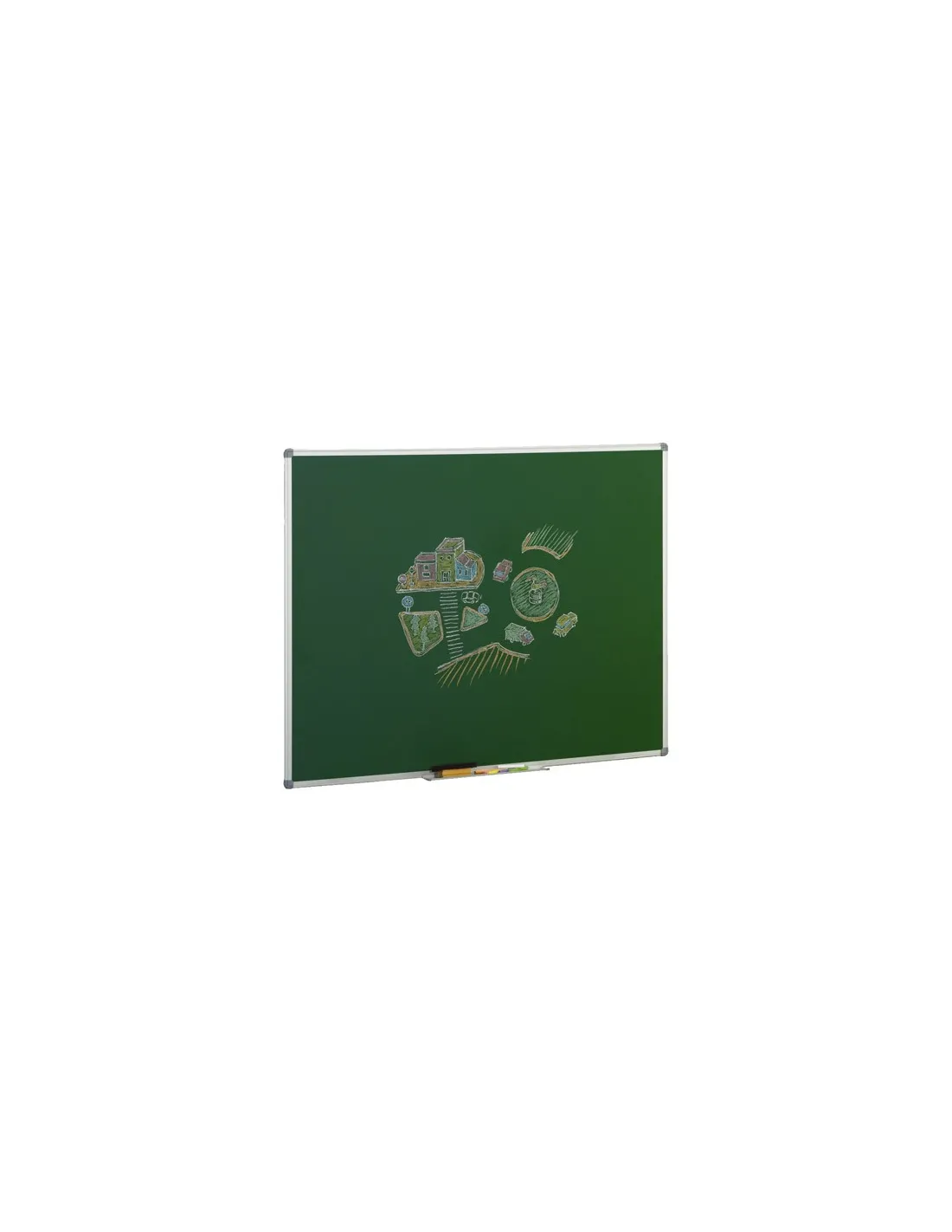 Garantía de la superficie 10 años. Con marco de aluminio y cantoneras decorativas. Superficie estratificada verde mate antireflectante. Suministrada con cajetín de aluminio de 40 cm y elementos de fijación. 122x150 cm.Pizarra verde 122x150cm