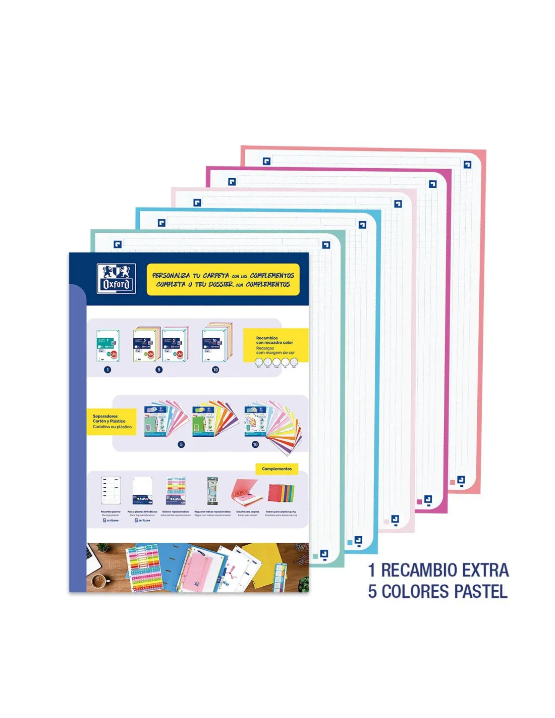 El pack promocional de Oxford incluye : 1 carpeta con recambio, 1 juego de 5 separadores plásticos y 1 recambio extra de 5 colores