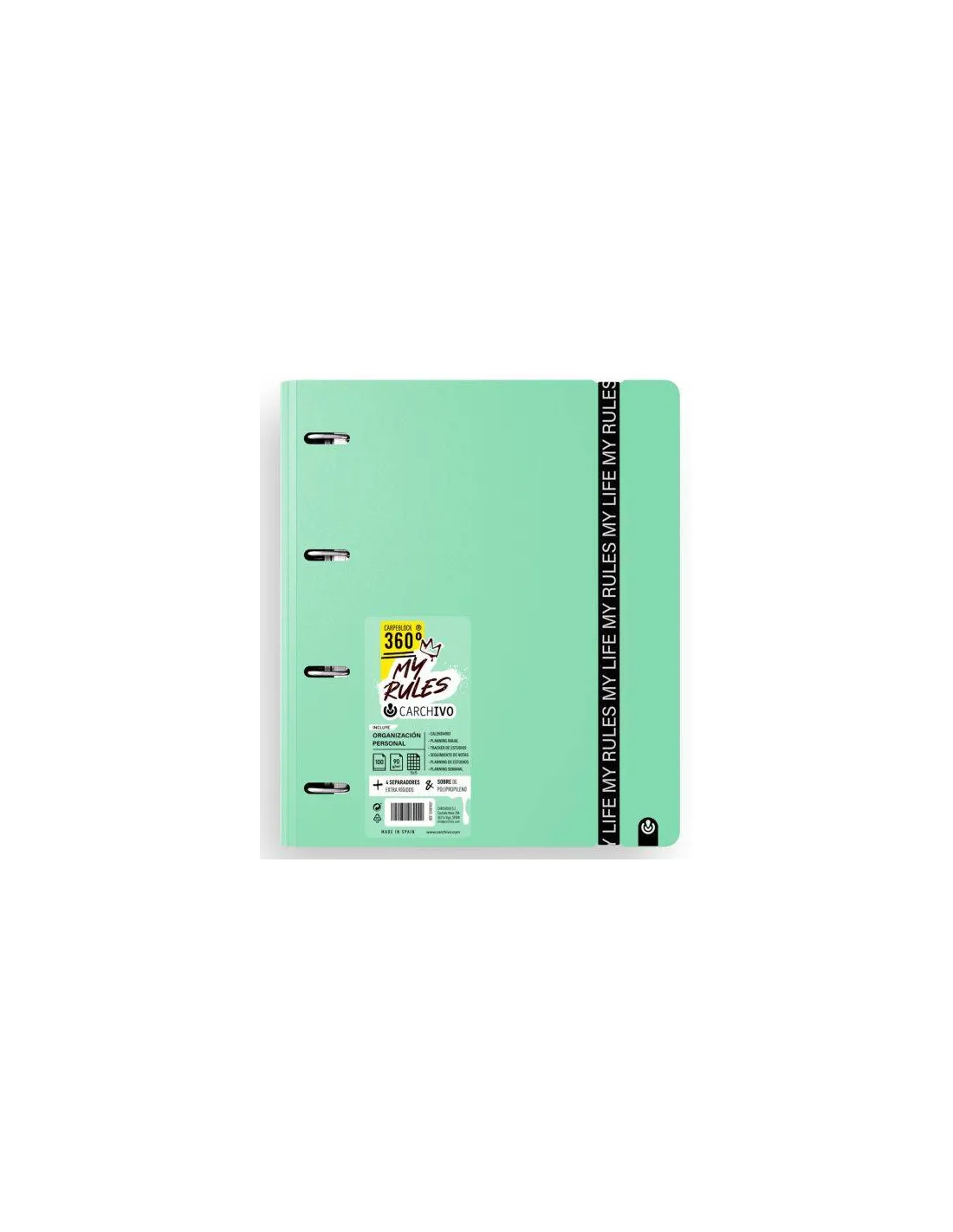 Además, ofrece hojas de organización como un calendario, tracker de notas, seguimiento de estudios (método pomodoro) y plannings semanales y anuales, para que tengas todo bajo control. Disponibles por color o en formato expositor. Características destacadas: Apertura 360º Carchivo®: Máxima practicidad, calidad y estilo. Diseño único: Goma tejida con el mensaje ""My Life, My Rules"". Colores vibrantes: Gris, deep blue, malva, jade y deep green. Accesorios nuevos: Sobre y separadores translúcidos con diseños exclusivos a la gama. Organización de asignaturas: Calendario, seguimiento de notas, tracker de estudios con el método pomodoro, planning semanal/anual. Edición limitada.