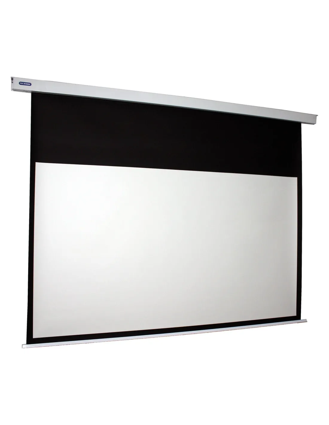 Pantalla Eléctrica, motor síncrono. Carcasa de chapa cuadrada color blanco. Tela proyección frontal: Matte White con perímetro negro de 5 cm. Trasera negra opaca. Fijación a techo o pared.