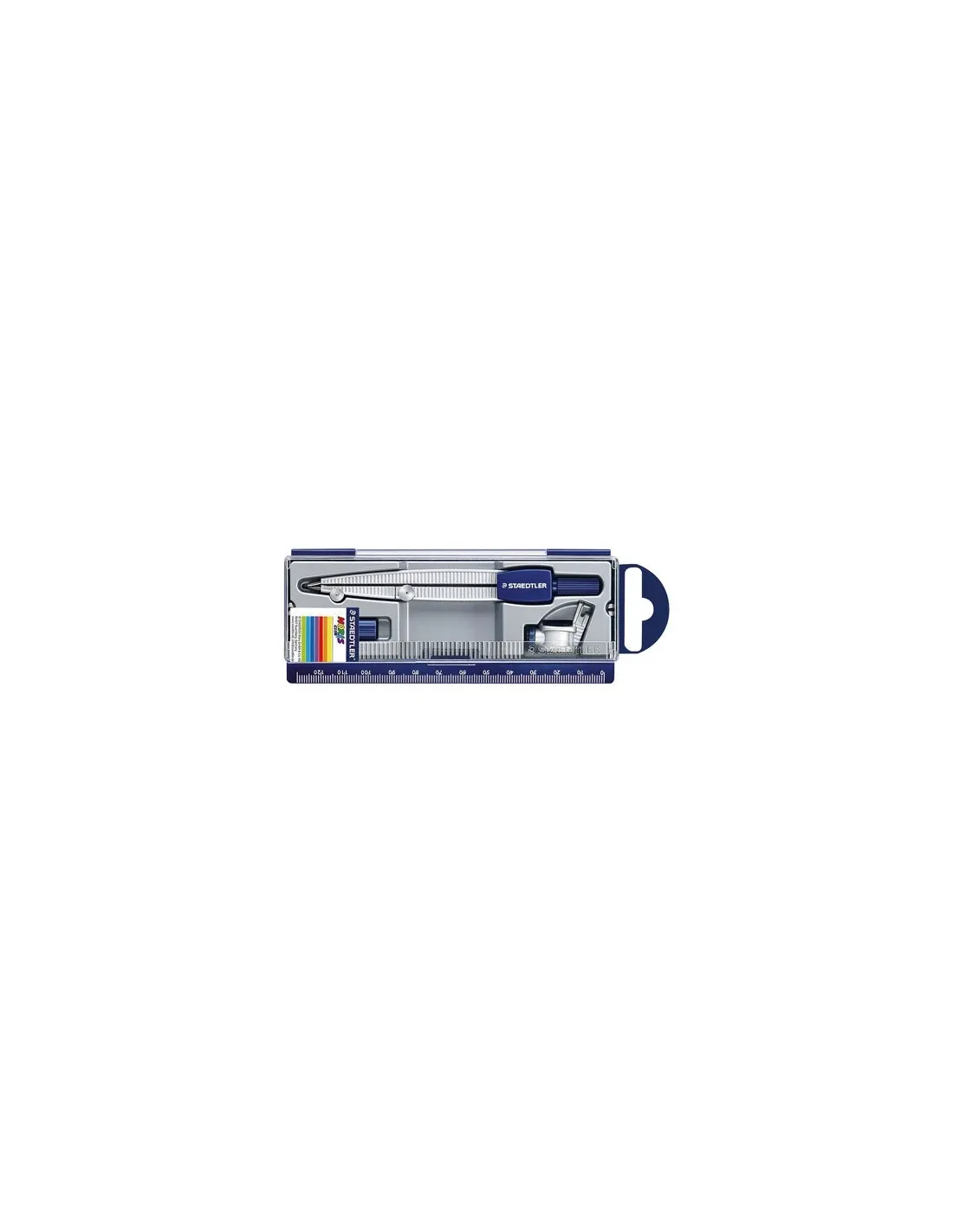 Compás de precisión con obtusángulo y aguja roma para evitar lesiones en la iniciación al manejo. Diámetro máximo 300 mm. Longitud 124,2 mm. En caja de plástico con tapa abatible y regla escolar, incluye mina, adaptador universal y tubo de minas.Compas Staedtler Noris club 550 60
