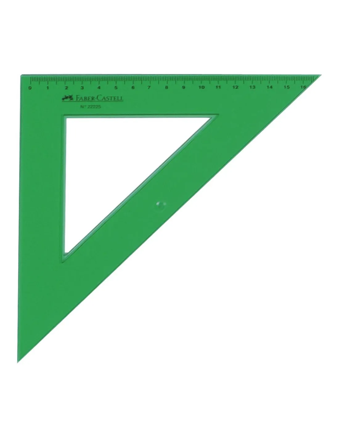 Escuadra Faber Castell para uso escolar, fabricada en plástico de inyectado verde transparente con graduaciones grabadas a prueba de emborronamiento