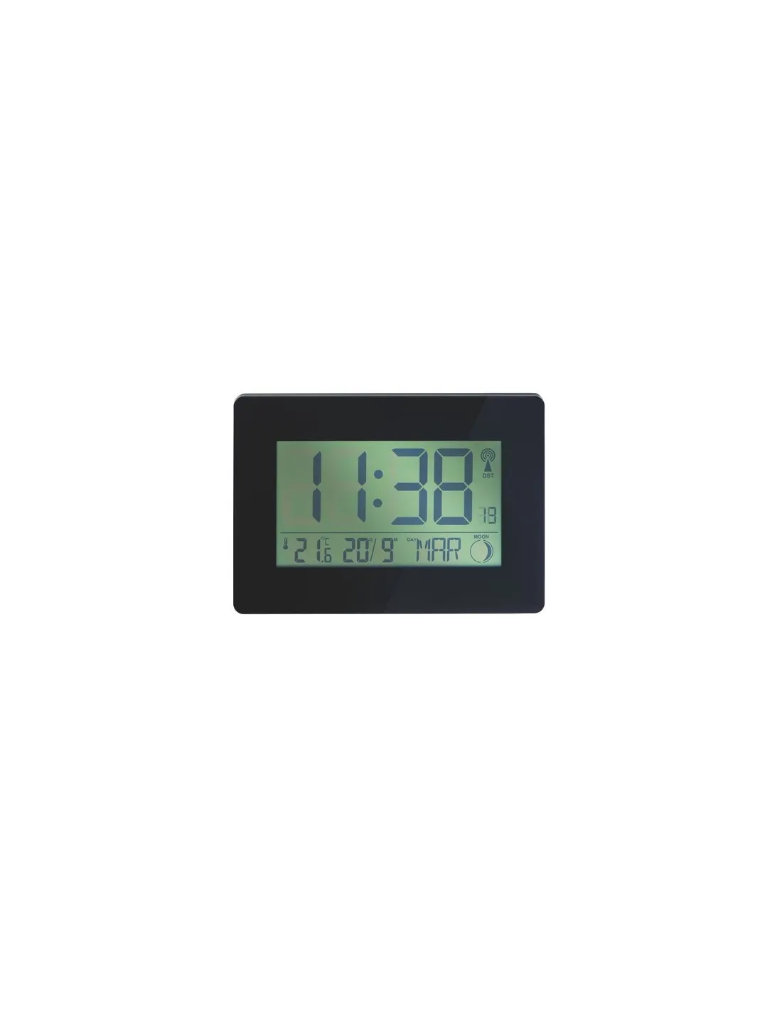 Reloj digital Austin radiocontrolado. Caja ABS, acabado brillante. Ancho cuadro 16,5 x 9,3 cm. Visualisación digital de la hora ( Alt 5,6 cm), temperatura interior y calendario. ( día/mes/año), fases lunarias. Selección de huso horario. Alarma con repetición. De sobremesa o pared.Caja ABS, acabado brillante. Ancho cuadro 16,5 x 9,3 cm. Visualisación digital de la hora ( Alt 5,6 cm), temperatura interior y calendario. ( día/mes/año), fases lunarias. Selección de huso horario. Alarma con repetición. De sobremesa o pared.