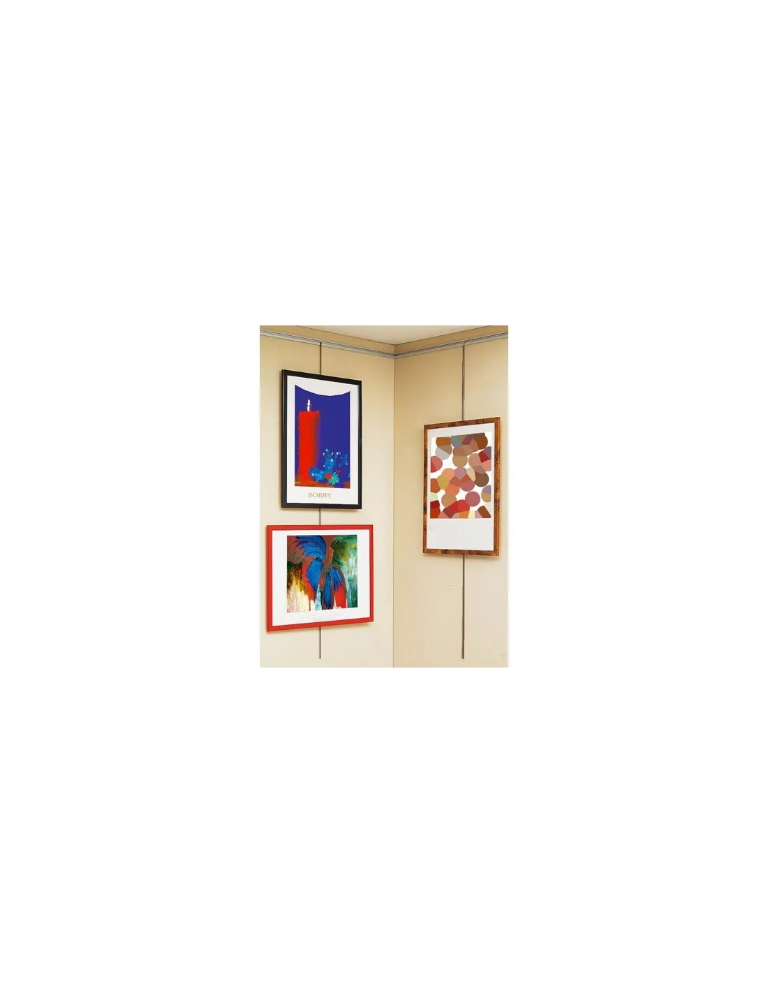 El conjunto incluye: 1 guía de 2 m de aluminio con tornillos y clavijas, 3 varillas de acero de 1,50m y 6 ganchos autobloqueadores de policarbonato transparente. resiste 30Kg por gancho.El sistema consta de un riel que se fija a la pared con una guía por la cual se deslizan unas varillas verticales para colgar cuadros a la altura deseada.
