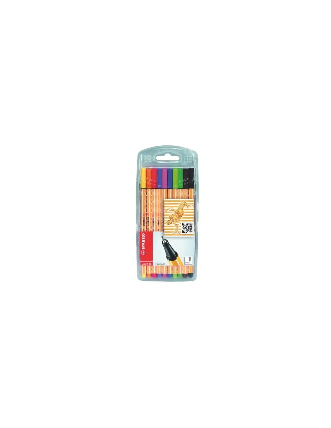 Blister 10 rotuladores Stabilo Point 88 surtidos.Bolsa de 10 surtidos: amarillo. naranja. rojo. azul. rosa. azul oscuro. verde claro. verde. marrón. negro. Rotulador con capuchón. Tinta muy fluida. Cuerpo hexagonal. Ideal para trazos precisos. gráficos y cartografías. Punta recubierta de metal extrafina. trazo 0.4 mm.olsa de 10 surtidos: amarillo. naranja. rojo. azul. rosa. azul oscuro. verde claro. verde. marrón. negro