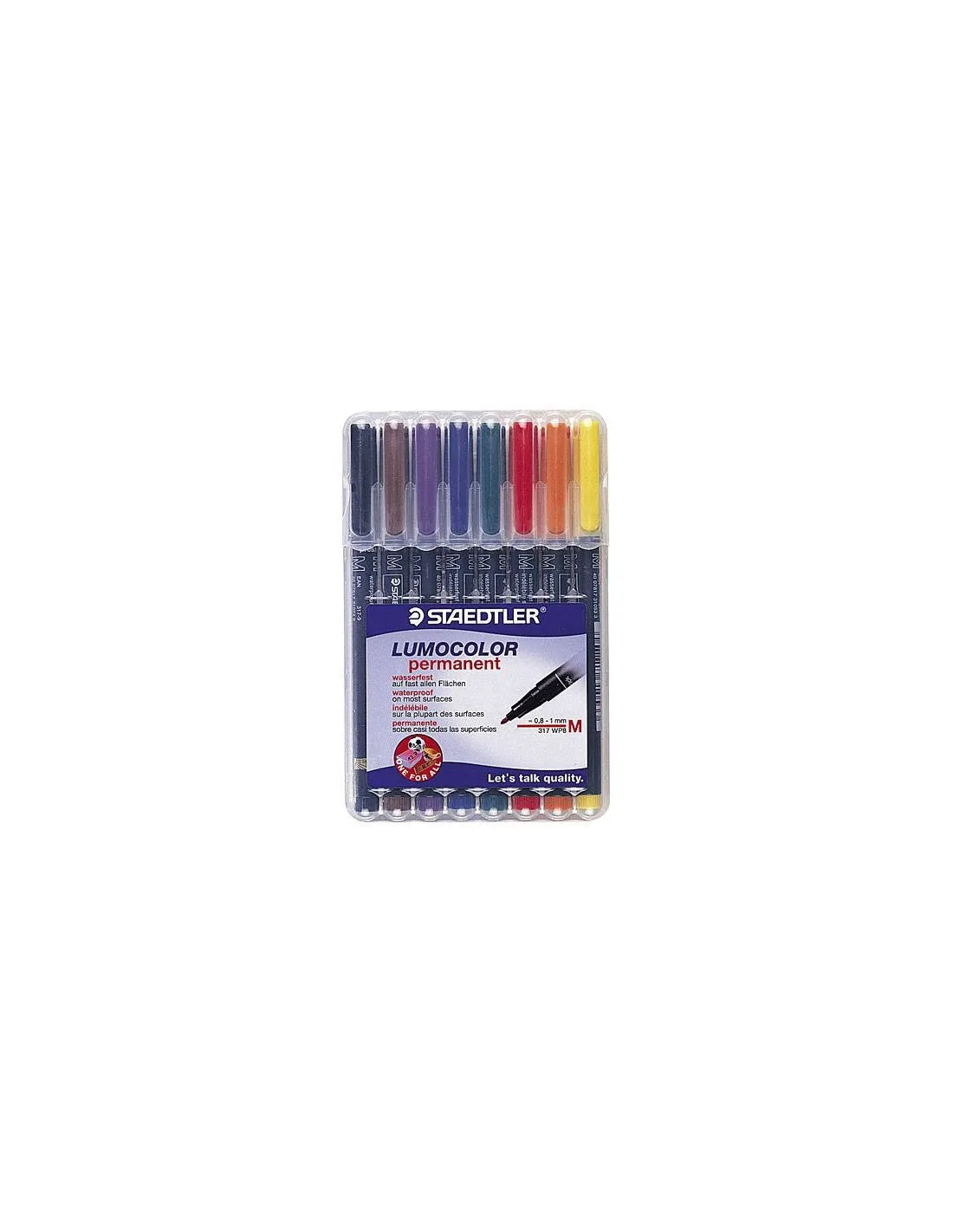 Rotulador universal para uso en transparencias y en casi todas las superficies. Tinta antisecado, pueden permanecer destapados varios días sin secarse. Colores brillantes, recargables. Punta media. Estuche 8 colores.Estuche 8 rotuladores permanentes Staedtler Lumocolor 0,8mm punta M