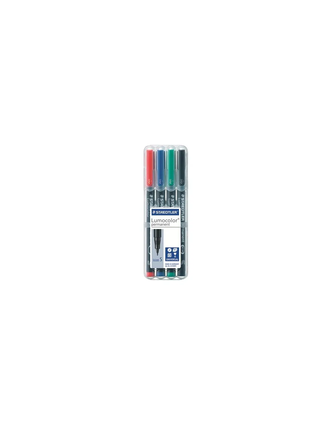 Estuche 4 rotuladores lumocolor S surtidos .Marcador permamente Lumocolor. Con capuchón. Escritura fluida y sin rebabas. Apto para todas las superfícies. Punta Extrafina. Trazo 0.4 mm. Estuche de 4 Lumocolor: negro. azul. rojo. verde