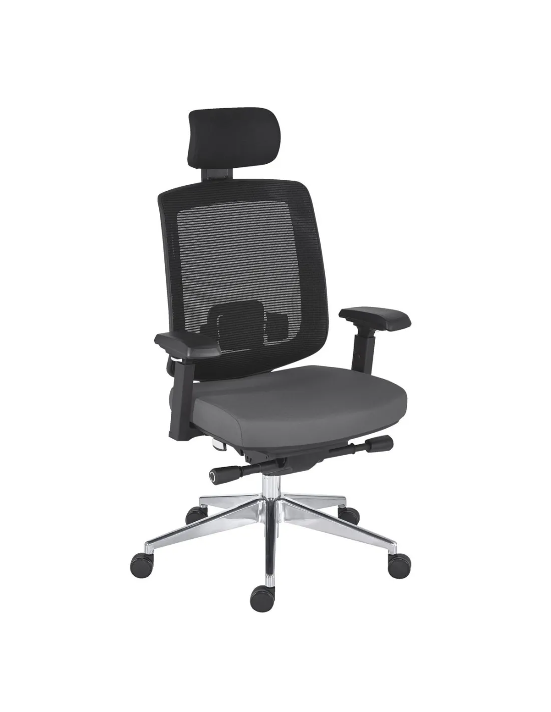 Silla de oficina ergonómica con asiento 100% poliéster ignífugo M1. Respaldo fijo Alt. 70 cm, de malla negra con cabezal regulable en altura hasta 5 cm. Soporte lumbar regulable en altura hasta 6 cm. Reposabrazos regulables en altura, adelante/atrás, profundidad y orientable. Patas de aluminio pulido. Ruedas para moqueta Ø 60 mm. Relleno: densidad asiento 70 kg/m3 Medidas: asiento An. 50 x Fon. 49 cm, regulable en altura de 49 a 58 cm Mecanismo sincronizado.