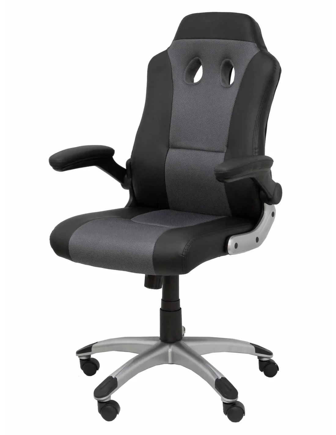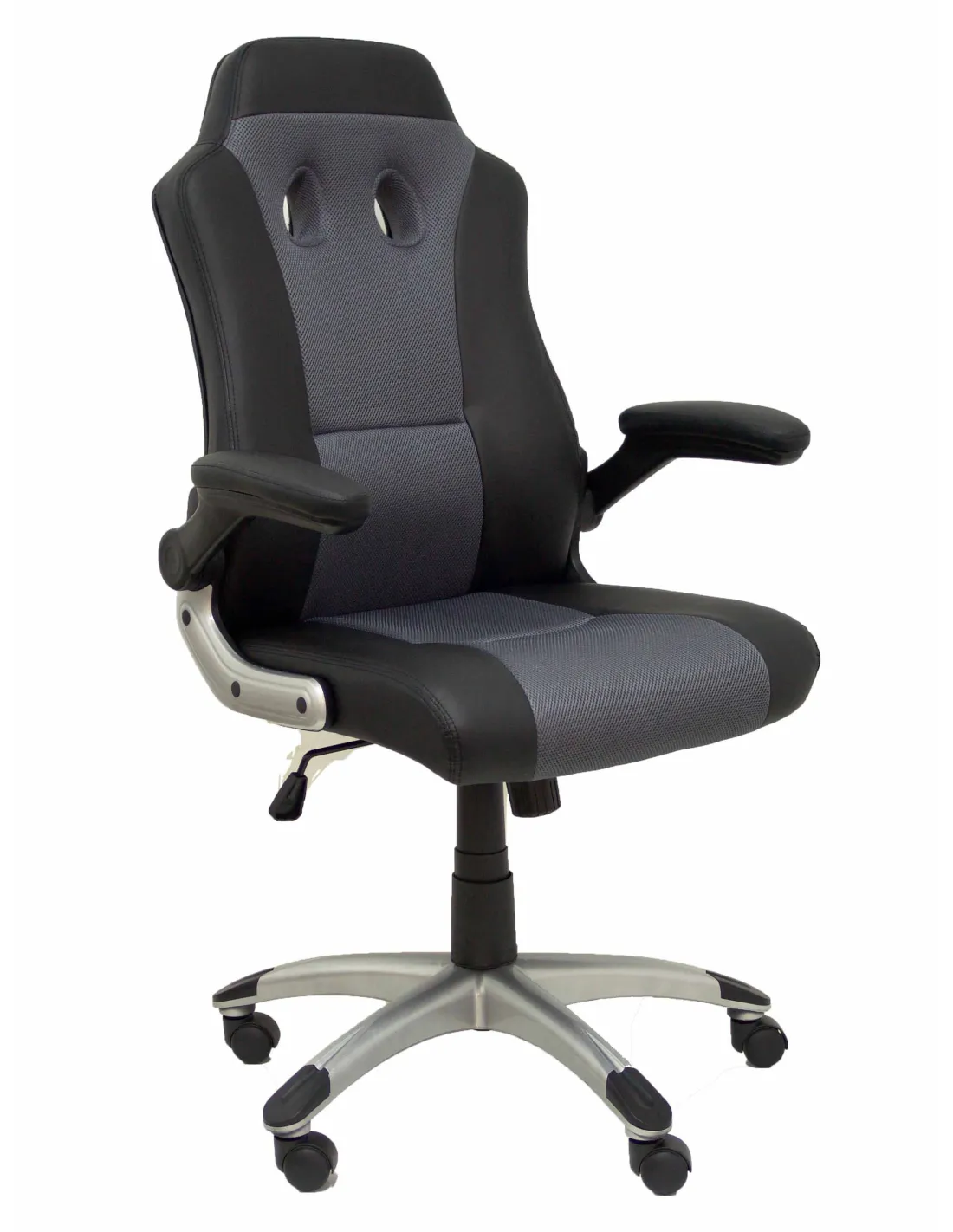 Detalles técnicos Respaldo ergonómico y acolchado para una mayor adaptabilidad a la espalda Asiento ergonómico y acolchado para una mayor comodidad del usuario Asiento y respaldo tapizados en tejido SIMILPIEL color negro y gris Relleno de alta calidad, espuma dura y cómoda Brazos retractiles incluidos