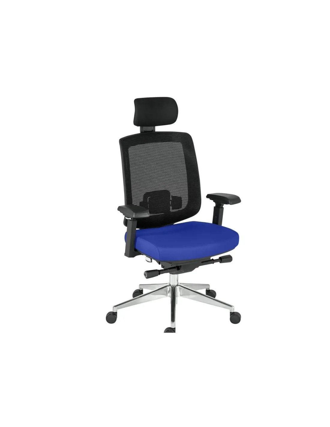 Silla de oficina ergonómica con asiento 100% poliéster ignífugo M1. Respaldo fijo Alt. 70 cm, de malla negra con cabezal regulable en altura hasta 5 cm. Soporte lumbar regulable en altura hasta 6 cm. Reposabrazos regulables en altura, adelante/atrás, profundidad y orientable. Patas de aluminio pulido. Ruedas para moqueta Ø 60 mm.