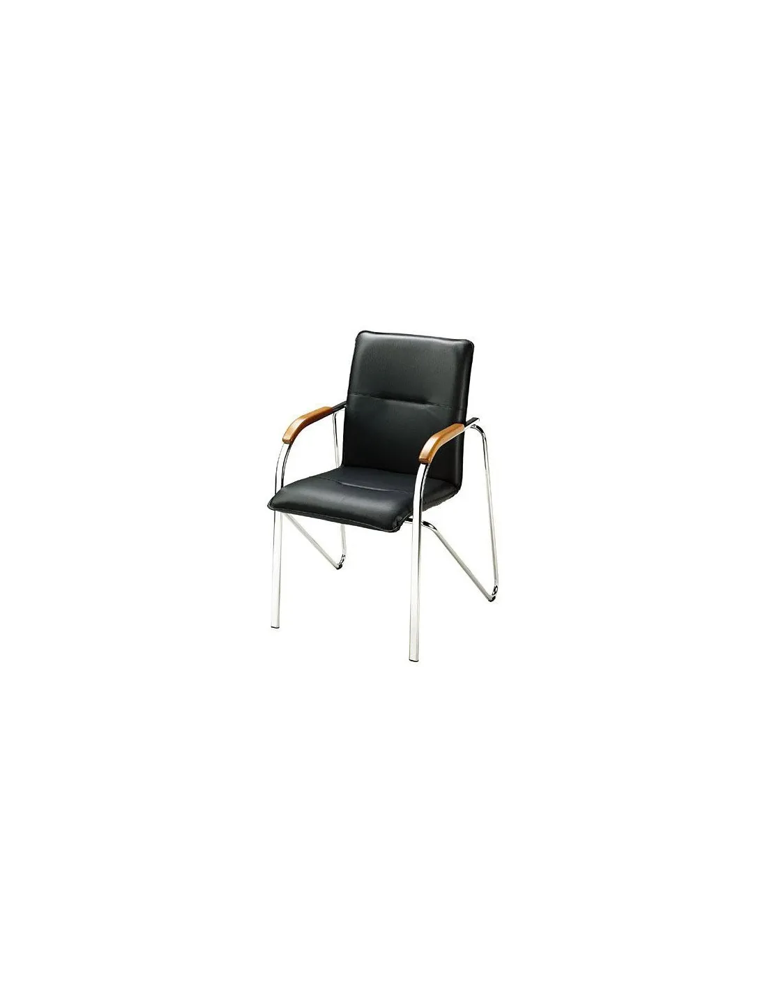 Asiento y respaldo de skai con aspecto de cuero. Reposabrazos de metal cromado con terminaciones en madera teñida. Patas de metal cromado. Medidas del asiento: 47x44cm. Alt. 43cm. Color negro repozabrazos cerezo.Sillón Brio Elegans apilable negro-cerezo