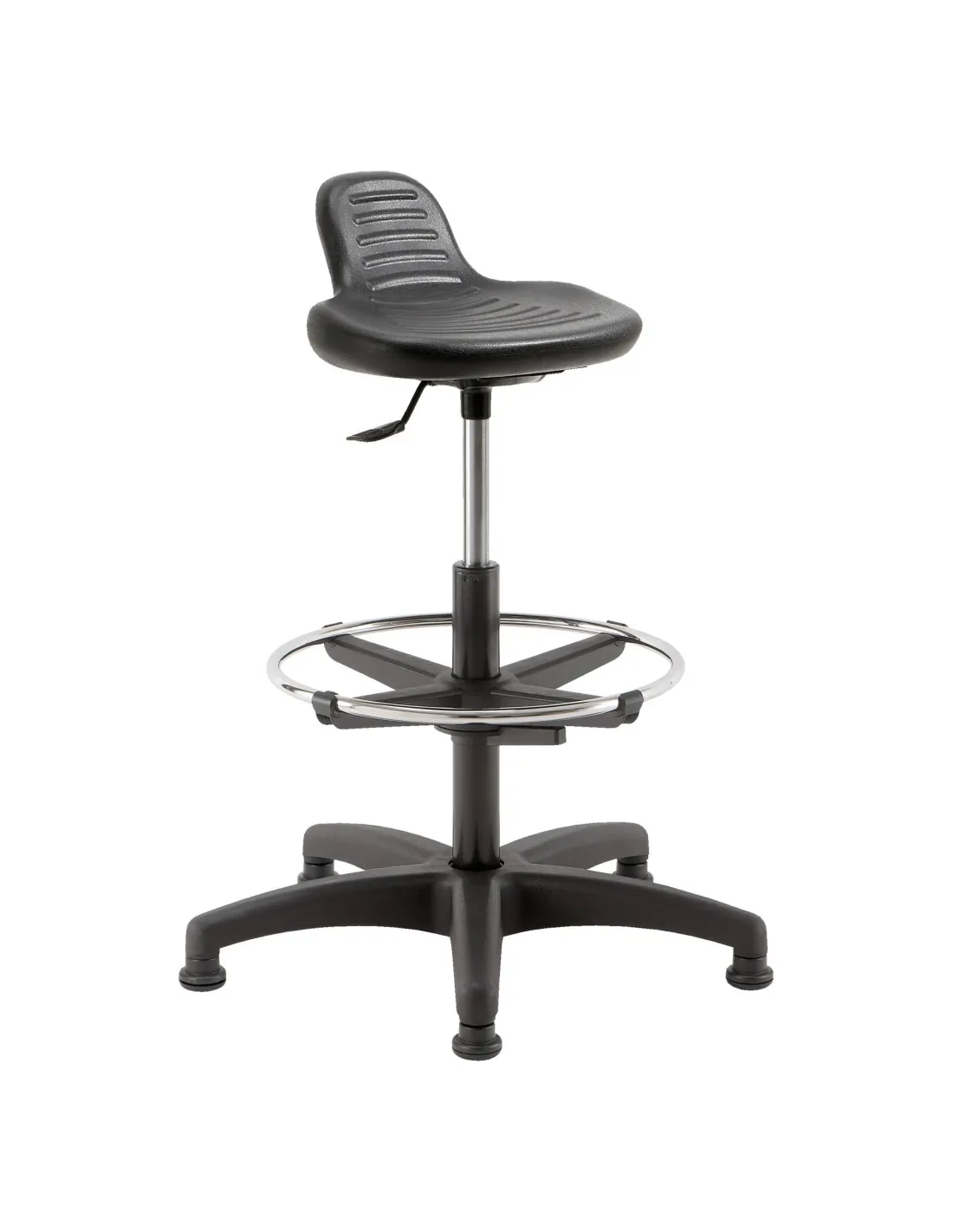 Asiento y respaldo de polipropileno negro sólido ( poliuretano ) y agradable. Esta silla de pie y sentado es ajustable en altura de 55 a 80 cm a mediante de un cilindro de elevación de gas controlado por una palanca ubicada bajo de su asiento que le permite ajustar la altura de su asiento, práctica cuando necesita cambiar de usuario o posición.