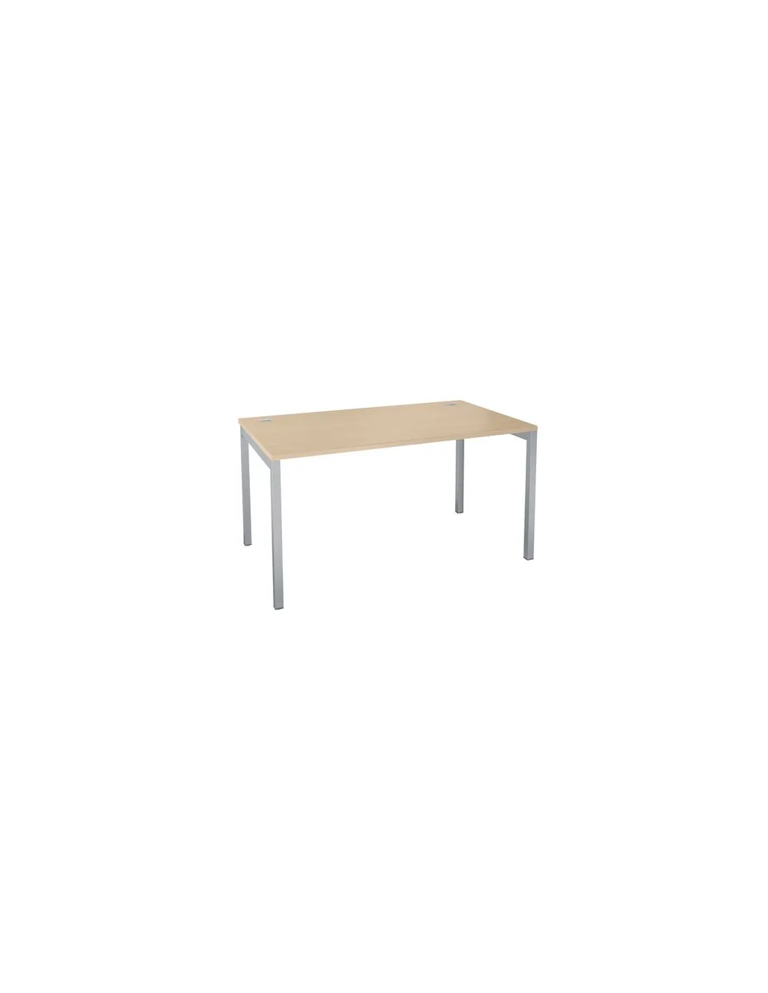 Tablero de paneles de partículas con revestimiento melaminado antirrayaduras y antirreflejos grosor 25 mm. Pasacables en el tablero Ø 50 mm. Cantos rectos ABS antichoque grosor 2 mm. Patas metálicas en forma de arco acabado aluminio sección cuadrada 40 x 40 mm con calzos regulables en altura en 15 mm. Panel de fondo opcional. Medidas: An. 160 x Fon. 80 x Alt. 74 cm.