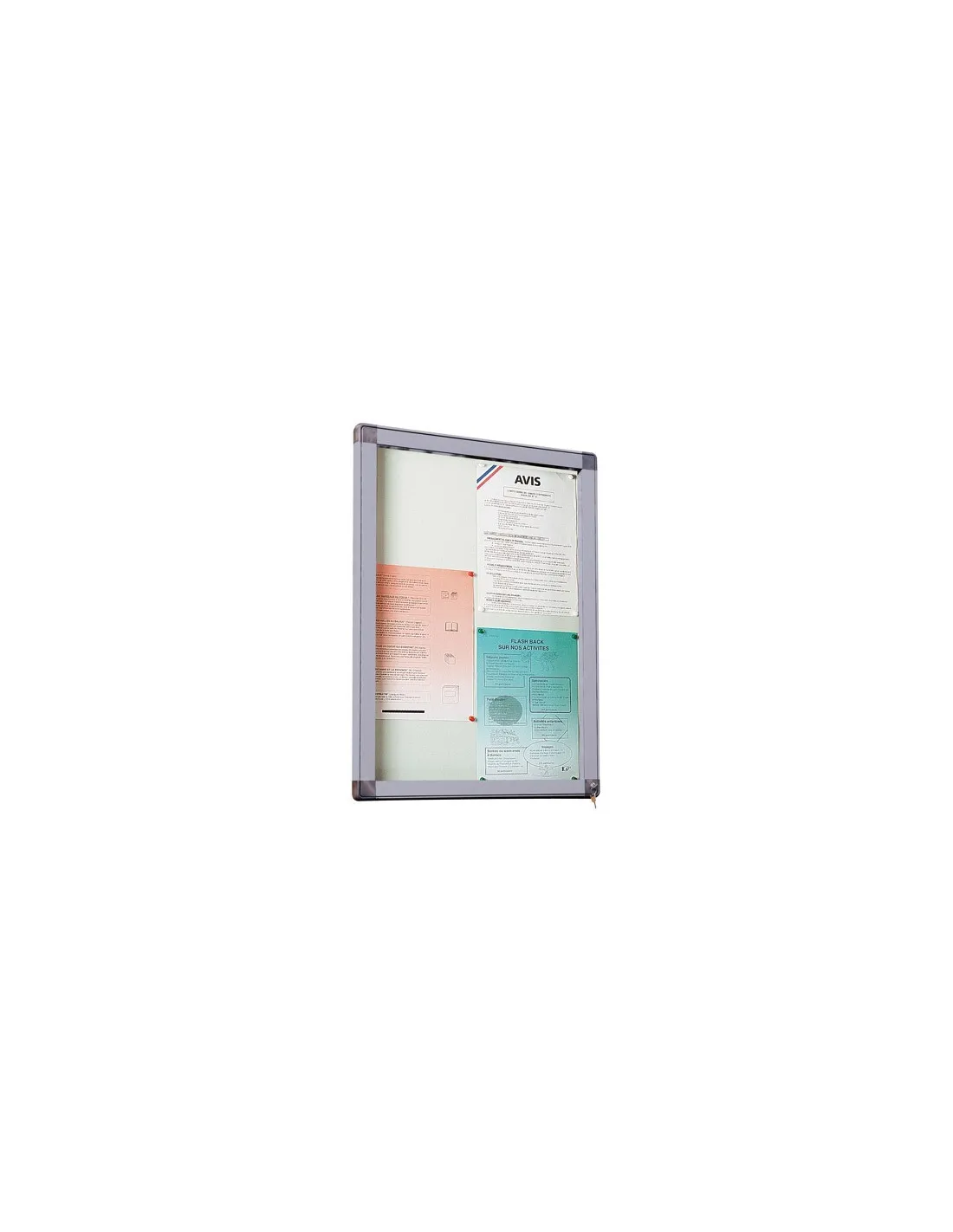 Cuadro perfilado de alumino lacado poliéster. 5 colores para elegir. Esquinas redondeadas, aspecto acero. Fondo metal prelacado gris (RAL 9002) Seguridad: Bisagras invertibles integradas en el marco y cerradura con doble cierre para mayor seguridad.Vitrina exterior 4 hojas gris