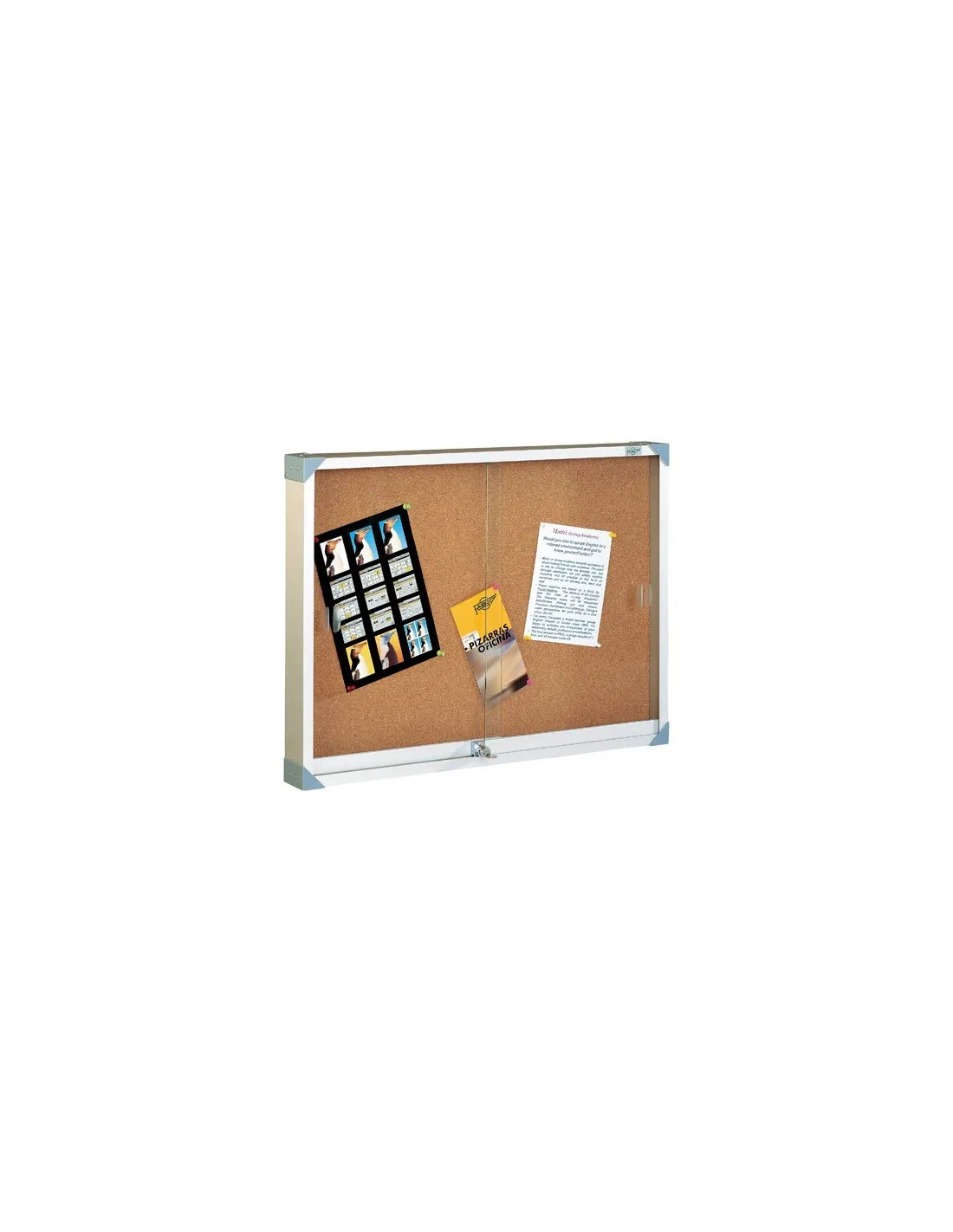 Sólida estructura en aluminio anodizado y superficie de corcho de 5 mm de espesor sobre soporte de madera aglomerada de 10 mm. Puertas correderas mediante mecanismo deslizante de rodamientos. Cantoneras de seguridad. Cerradura con llave. 80x100x8cm.Vitrina anuncios 800x1000x80