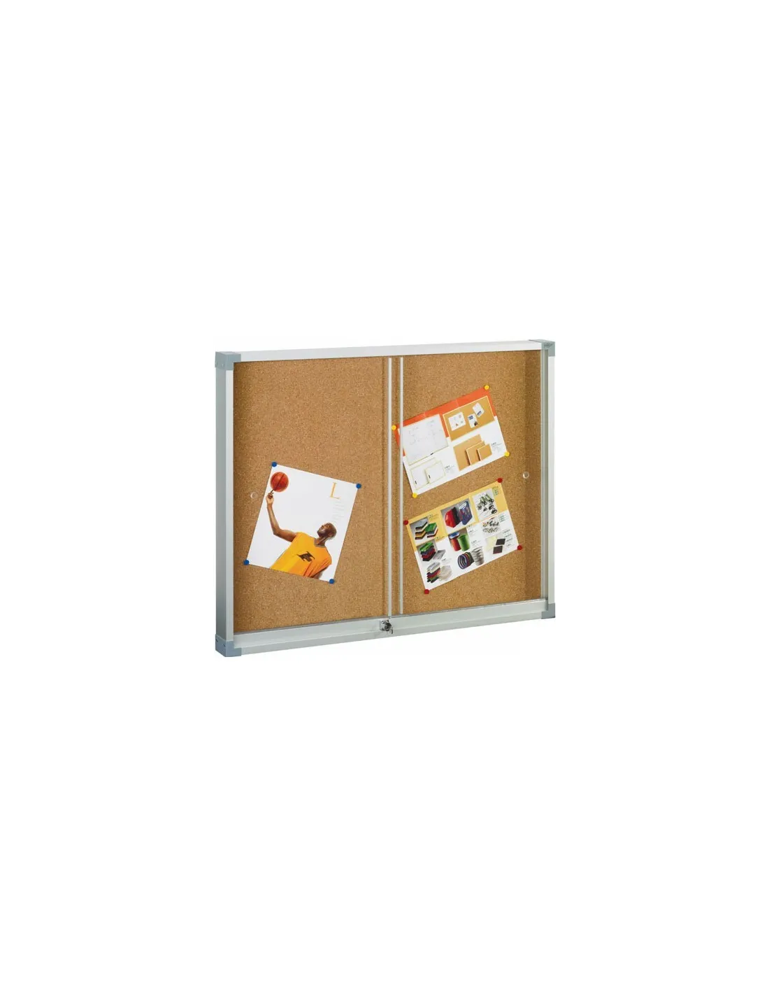 Sólida estructura en aluminio anonizado y cantoneras decorativas. Puertas de metacrilato correderas mediante mecanismo deslizante de rodamiento. Suministradas con elementos de fijación. Cerradura con llave. 80x100 cm.Vitrina para anuncios 80x100