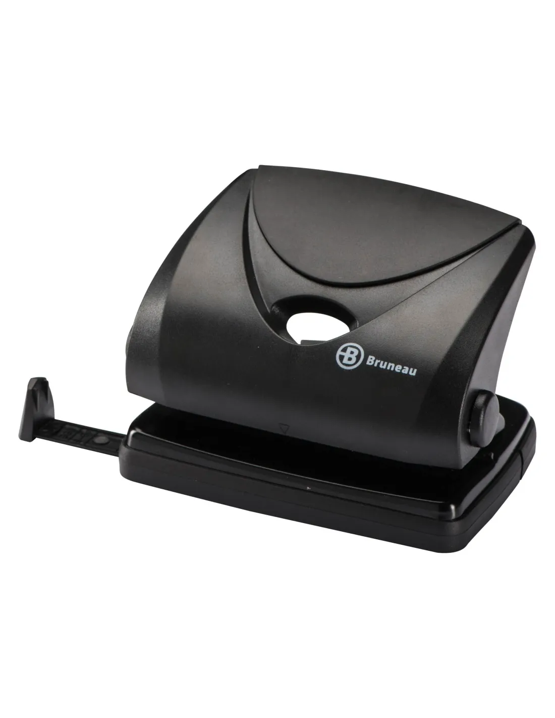 Perforadora de escritorio con regleta de guía integrada que permite controlar la alineación de los papeles y la ubicación de los orificios.