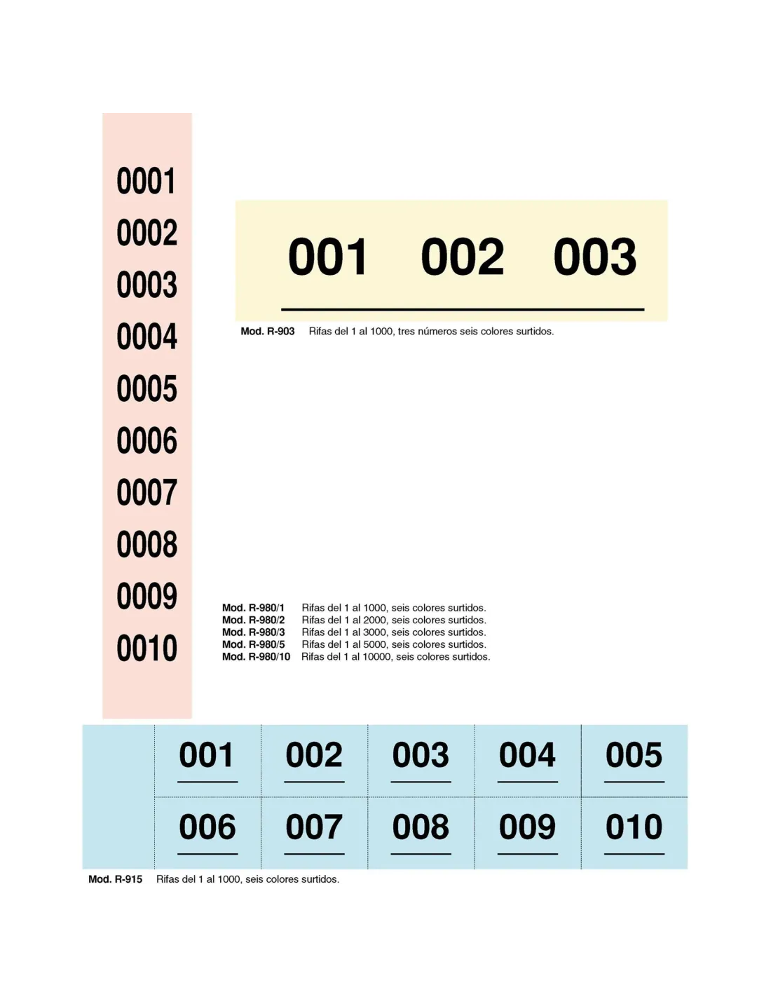Talonario de rifa horizontal. Transcripción sin carbón. Papel 60 g. Formato 205 x 150 mm apaisado. 1 copia Castellano (Númerado del 001 al 999). Colores surtidos aleatorios.