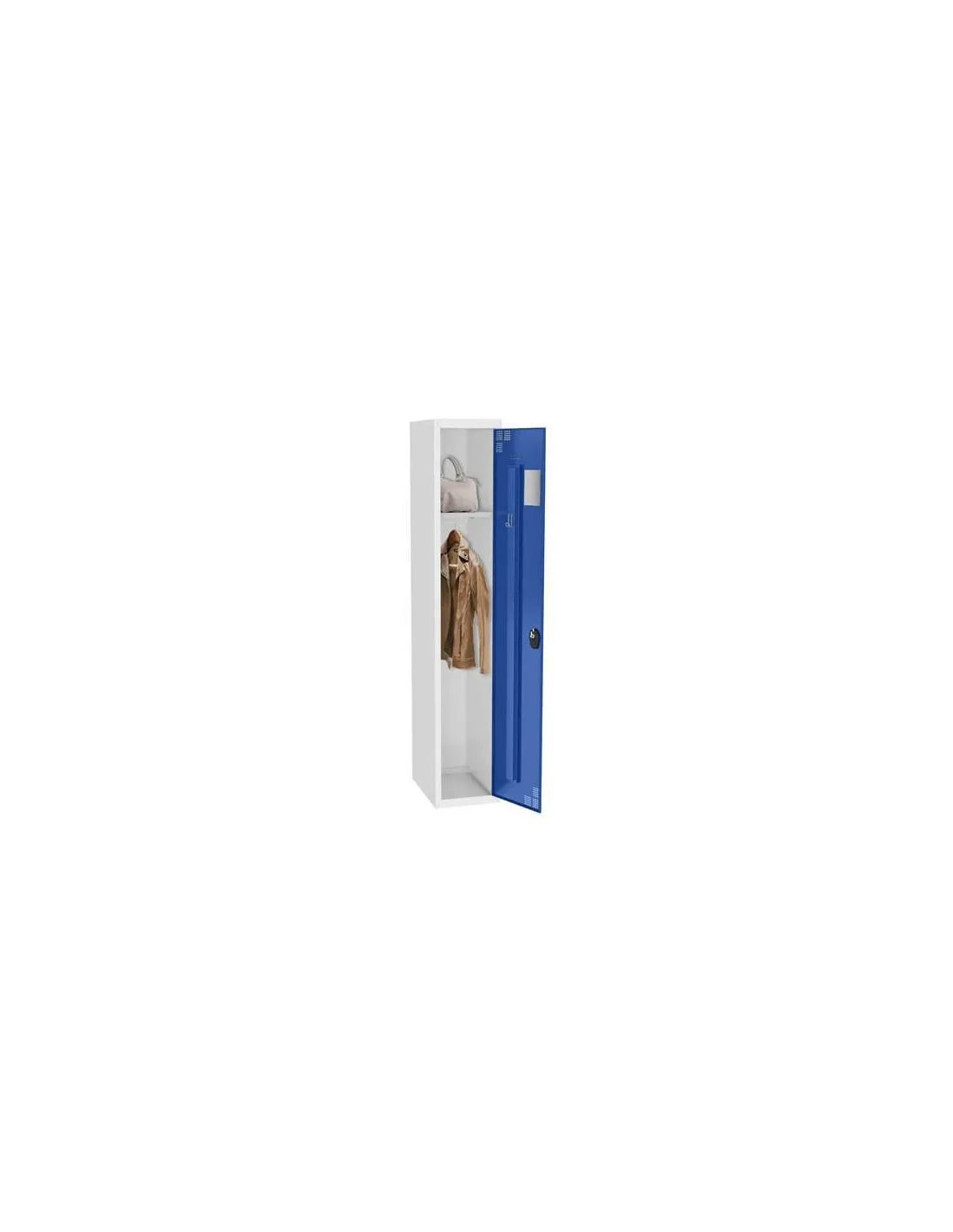 Porta etiquetas en cada compartimento. ( etiquetas no incluidas). Equipamiento vestuario : 1 balda con 1 barra para perchas y 1 gancho porta toalla. Gancho adicional en la puerta y un espejo.