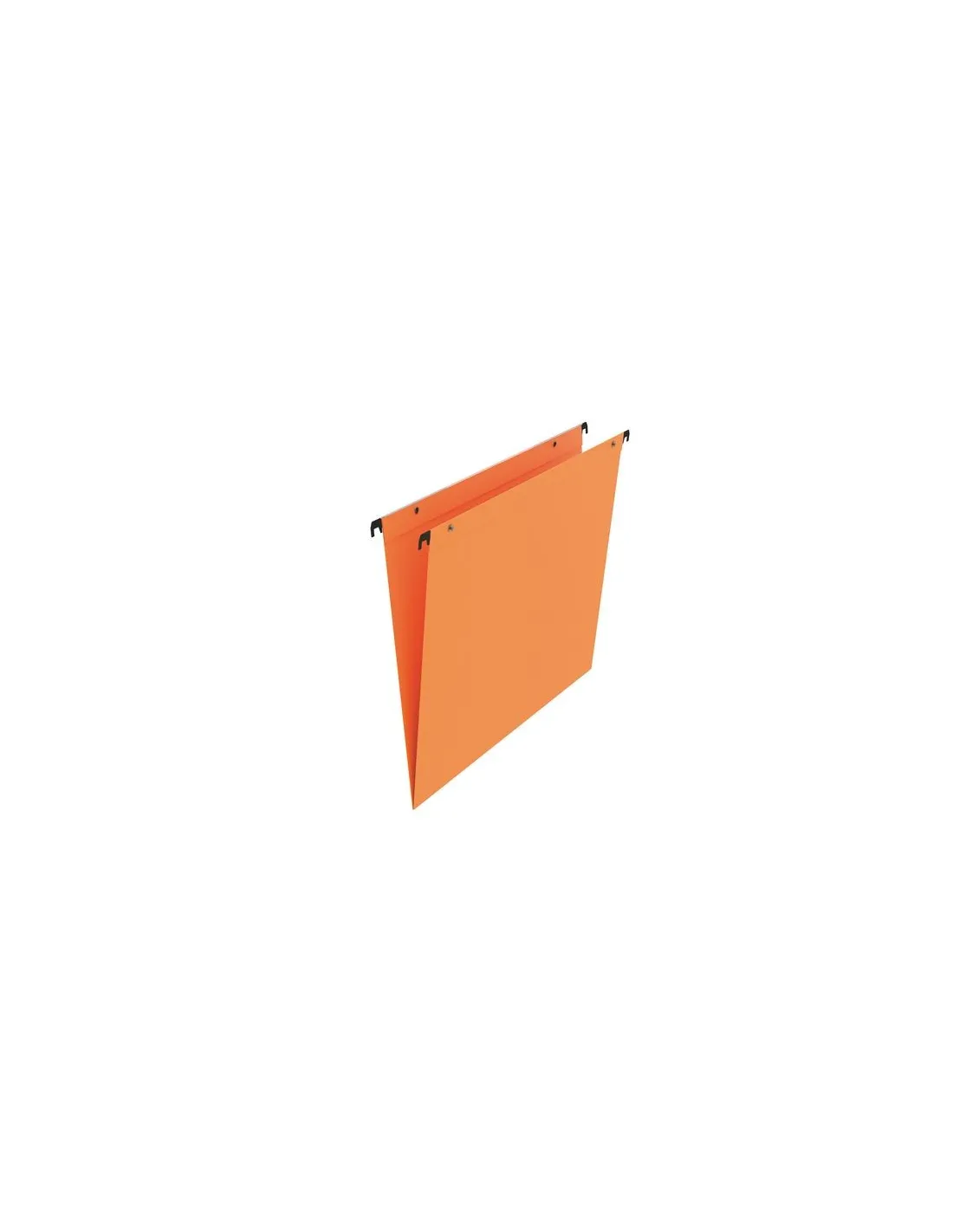 Carpetas fabricadas en Kraft marrón o color 220 g/m2. Varilla de suspensión en poliestireno negro indeformable. Visor largo de 135 mm, con efecto lupa. Paquete de 25 unidades.Carpeta fabricada en Kraft naranja de 210 g. Formato A4 (24,2 x 31,2 cm). Varilla de plástico negro indeformable. Visor largo portaetiquetas de 135 mm, con efecto lupa y etiquetas para nombrar el contenido. Lomo normal en V.